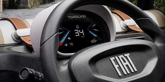 O Topolino também fica mais intuitivo com o seu novo painel de instrumentos, que cresceu de 3,5 para 5,7 polegadas, ocupando uma área total de 8,3 polegadas. O novo cluster digital do Topolino apresenta gráficos simplificados, com maior leitura e uma linguagem visual mais leve e amigável.
