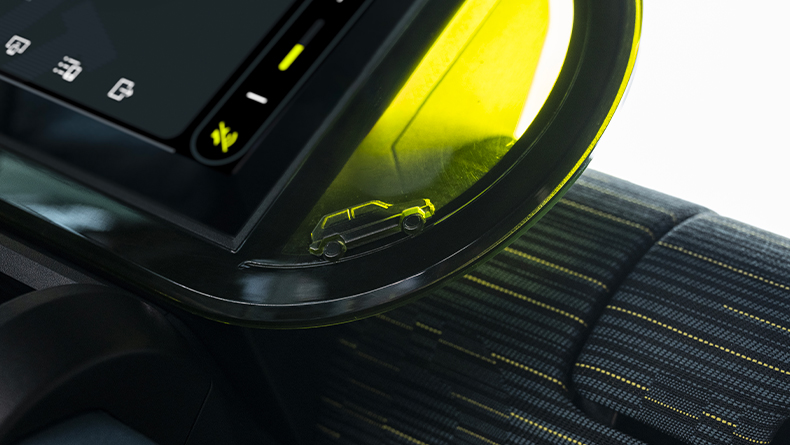 O painel de instrumentos envolto em tecido “Style” apresenta um porta-luvas superior e uma moldura amarela com formas inspiradas no Lingotto.